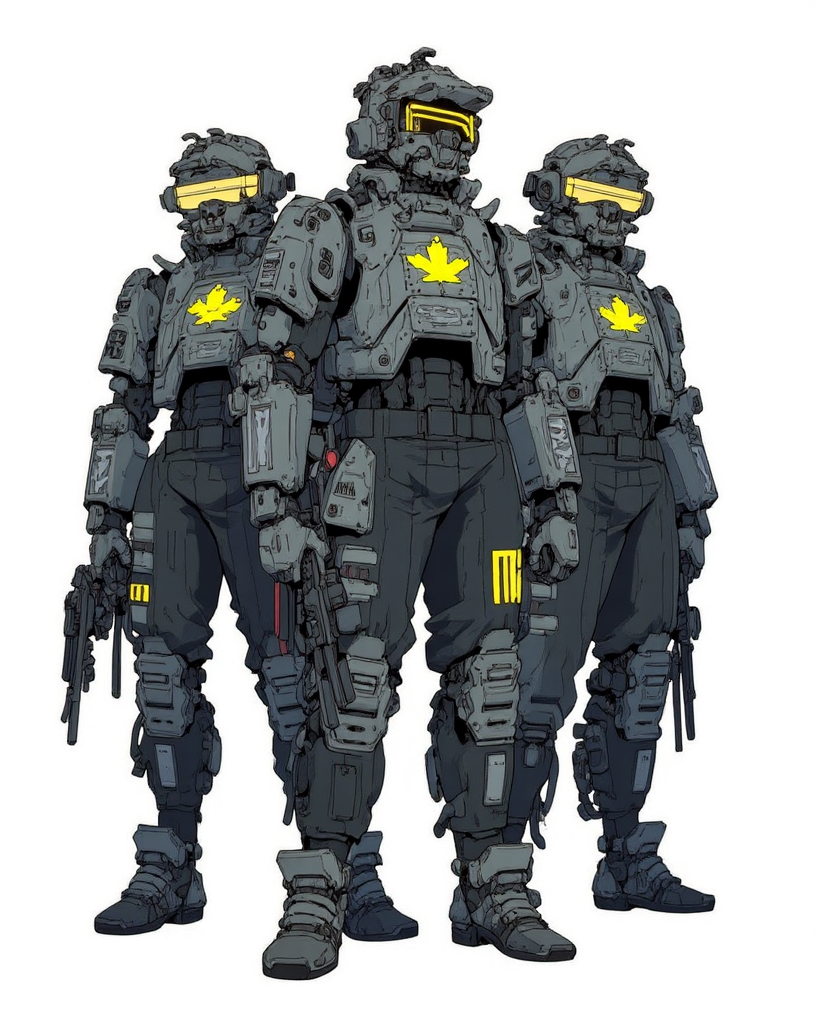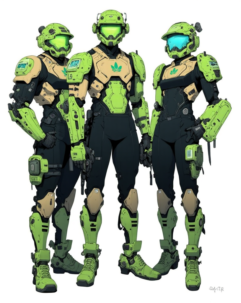 | Style | Corporate-Military, futuristic tactical gear with scientific insignias |